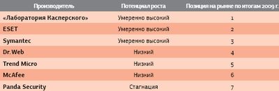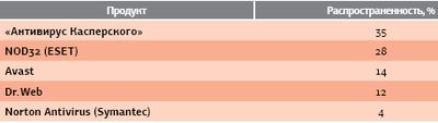 Интересны и результаты анализа рынка антивирусов, проведенного исследовательским холдингом «Ромир». Так, согласно опубликованным за 2009 г. данным, пользователи домашних компьютеров отдают предпочтение следующим антивирусным приложениям:
