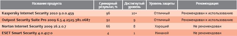 Антивирус KIS 2009 показал один из лучших результатов, обнаружив восемь из девяти вредоносов и практически не побеспокоив пользователя вопросами и оповещениями. А вот Outpost, работавший в режиме автообучения, пропустил почти половину угроз — четыре из девяти. Хотя, по утверждениям аналитиков, при полном отключении режима обучения он мог продемонстрировать лучший результат, но тогда пользователь гарантированно столкнулся бы с большим количеством всевозможных сообщений.