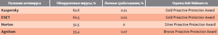 В этом тесте сравнивались только эвристические компоненты антивирусной защиты большинства популярных в России продуктов. На итоговую оценку оказали влияние не только обнаруженные угрозы, но и ложные срабатывания. Ниже приведены результаты прохождения теста участниками данного обзора. Более полная информация о тесте приведена на http://anti-malware.ru/proactive_test_2009.