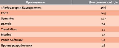 Для данного обзора были взяты лишь несколько продуктов, разрабатываемых сильнейшими участниками рынка антивирусного ПО. При отборе мы учитывали данные исследований, проведенных независимыми компаниями. Так, согласно отчетам лаборатории Anti-Malware, в 2008 г. в России рынок распределился среди разработчиков антивирусного ПО следующим образом: