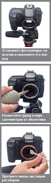Зеркальную камеру, если это возможно, закрепите на надежном штативе. Аккуратно наклоните объектив вниз. Благодаря штативу ваши руки останутся свободными, что упростит удаление посторонних частиц. В меню зеркального фотоаппарата выберите режим Mirror-lock cleaning, при котором зеркало поднимается над матрицей. Батарея должна быть заряжена. Если в процессе чистки питание вдруг отключится, зеркало опустится вниз и может нанести повреждения.