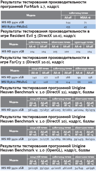 Для наглядности в таблицах мы также привели результаты тестирования видеоплаты AMD Radeon HD 5870 компании MSI. Тестирование показало, что не во всех играх наблюдался прирост производительности. В нашем случае количество кадров в секунду, вероятнее всего, ограничивается производительностью процессора. Кроме того, не стоит забывать о существовании игр, неспособных использовать несколько ГП. Самые высокие результаты Radeon HD 5970 показал в игре FarCry 2 и синтетических тестах — очевидно, современные игры еще не рассчитаны на такое быстрое «железо». В настоящее время приобретение данной видеокарты может быть оправдано желанием использовать технологию ATI Eyefinity — разрешение трех мониторов позволит в полной мере раскрыть потенциал Hemlock.