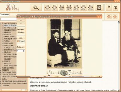 Однако содержание содержанием, а до содержимого порой еще надо докопаться — доводилось работать с энциклопедиями, обещанные возможности которых открывались лишь после общения с техподдержкой. Впрочем, к «Чеховской энциклопедии» это не относится. Здесь все предельно просто. В левой колонке экрана находится «Оглавление». В нем все тексты Антона Павловича разбиты на разделы: «Драматические произведения», «Публицистика», «Повести», «Рассказы и юморески »… Справа — рабочее окно, где появляется вызванный материал. Вверху размещены доступные аудиоразделы — «Произведения Антоши Чехонте», «Произведения 1880—1885 годов», «Произведения 1886 года»,— в каждом из которых по нескольку озвученных текстов.