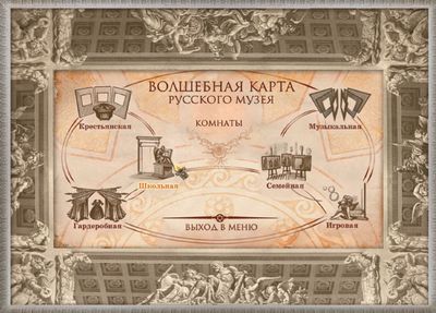 Итак, двое маленьких посетителей музея, сестра и брат, неожиданно очутились в его виртуальном отображении. Чтобы выбраться в реальный мир, они должны выполнить несколько заданий. Виртуальное пространство Русского музея разделено на шесть тематических зон: гардеробную, школьную, семейную, игровую, музыкальную и крестьянскую. В каждой из них ребят ожидают свои задания. В гардеробной, как и следует из ее названия, нужно быть внимательным к туалетам персонажей на детских портретах, для того чтобы правильно восстановить по памяти предметы их одежды. В школьной зоне необходимо по описанию, представленному контуром и словесно, а иногда и в виде загадок, отыскать изображения предметов на картинах. В семейной зоне для поиска объектов предлагаются только силуэты, но по-прежнему главная цель заключается в том, чтобы внимательно рассматривать ту или иную картину на тему семейного быта. В игровой зоне развлекательных заданий побольше. Здесь даже реставрирована (в виртуальном варианте) такая старинная игра, как катание пасхальных яиц. В музыкальной части требуется выбрать из предлагаемого набора те звуки, которые соответствовали бы сюжету представленной картины. В области крестьянской темы предметы на картинах следует отыскивать по их названиям.