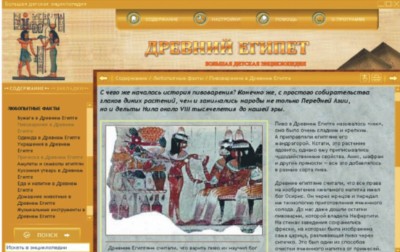 Немало любопытных фактов собрано и в разделе энциклопедии, имеющем то же название, что и сама программа. В нем рассказывается о древнеегипетских музыкальных инструментах, еде и напитках, прическах, амулетах и символах египтян. Взрослых (по крайней мере, мужчин), несомненно, заинтересует статья «Пивоварение в Древнем Египте».
