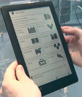 Растет и список устройств на электронных чернилах. Так, ASUS представила э-книжку DR-900 E-Reader, имеющую 9-дюймовый экран с разрешением 1024×768 точек и встроенную память объемом 2 или 4 Гбайт (на фото на стр. 73 слева). Кроме того, модель будет снабжена модулями беспроводной связи Wi-Fi или 3G для скачивания материалов непосредственно из Интернета. Компания MSI тоже показала любопытный продукт — ее электронная книга раскрывается, как обычная, и пользователь может читать текст на обеих страницах, как и в бумажной интерпретации.