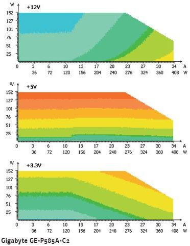 Стендовые испытания выявили малую нагрузочную способность низковольтных (+3,3 В и +5 В) каналов: при токах свыше 10 А напряжение падает ниже номинала, особенно это заметно на линии +5 В, где минимальное значение составляет почти 4,7 В. Конечно, формально показатели, отличающиеся от номинала на 1—4% в меньшую сторону, плохими назвать нельзя, но, как показывает практика, всегда лучше иметь запас в большую сторону.