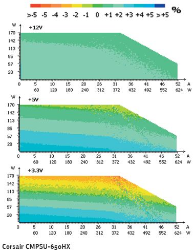 Стабильность напряжения на канале +12 В у этого блока высока, даже при максимальной загрузке (а это 624 Вт) напряжение не падает ниже 12,07 В. Максимальное зафиксированное значение — 12,2 В. На каналах +3,3 и +5 В в зависимости от нагрузки напряжения колеблются от 3,19 до 3,45 В и от 4,9 до 5,18 В соответственно.