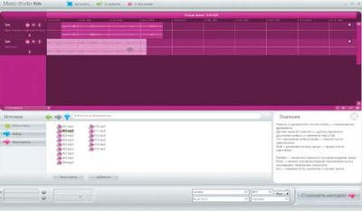 Работать с «библиотечными» образцами, так же как и с файлами своей музыкальной коллекции, достаточно просто. После того как вы прослушаете выбранный фрагмент (кнопка «Прослушать» или двойной щелчок на имени файла), можете добавить его в рабочее окно редактора (обычным перетаскиванием или с помощью кнопки «Добавить»). В результате в окне появятся название трека и инструменты для работы с ним: регулятор громкости, выключатель дорожки, переключатель в режим «соло».