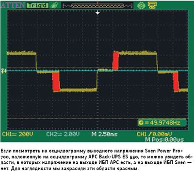 Все определяет ступенчато- аппроксимированная синусоида — данный сигнал представляет собой сумму положительного и отрицательного меандров, разнесенных на половину периода. Продолжительности импульсов подбираются так, чтобы среднеквадратичное напряжение соответствовало сетевому. Однако если посмотреть на осциллограмму выходного напряжения Sven Power Pro+ 700, наложенную на осциллограмму APC Back-UPS ES 550, то можно увидеть области, в которых напряжение на изделии APC есть, а на устройстве Sven — нет. Для наглядности мы закрасили эти области красным (см. рис. на с. 21).