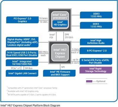 Процессоры Intel Core второго поколения несовместимы с наборами микросхем предыдущей серии. Новая платформа включает в себя два чипсета для настольных ПК: P67 Express и H67 Express. Обе микросхемы РСН (Platform Controller Hub) способны обеспечить до восьми линий PCI Express через порты х1, х2 или х4, до 14 портов USB 2.0, четыре порта SATA 2 и два — SATA 3. Обе они поддерживают режимы RAID 0, 1, 5, 10.