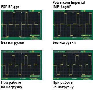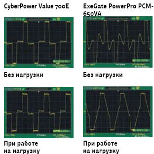 Как видите, осциллограммы выходного напряжения у PowerPro PCM-650VA значительно отличаются от привычной двуступенчатой аппроксимации синусоиды, которую выдают остальные устройства. Причина данного явления, а также то, было ли это предусмотрено разработчиками или стало следствием несовершенства каких-либо компонентов ИБП, нам неизвестны. Впрочем, саму по себе такую особенность вряд ли можно считать недостатком. Напротив, получившийся сигнал по форме даже ближе к эталонной синусоиде, чем двуступенчатая аппроксимация. При работе с нагрузкой действующее значение выходного напряжения находится в пределах 230—240 В, что хотя и выше нормы, но все же допустимо. Частота выходного напряжения у данного ИБП составляет не привычные 50, а 53 Гц.