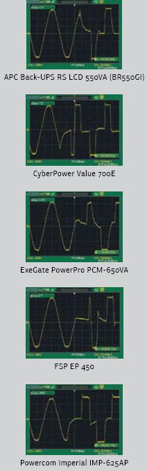 Все рассмотренные в этом обзоре ИБП, как и большинство продукции на рынке, являются интерактивными. Вообще-то, жесткая стабилизация напряжения для компьютерного блока питания не является обязательной, особенно если это качественный БП. Например, Enermax ERV850EWT, установленный в наш тестовый стенд, способен работать при падении действующего значения входного напряжения до 80 В. Это создает повышенную нагрузку на входную цепь блока питания, поэтому долго эксплуатировать его в таком режиме мы никому не советуем. Однако очевидно, что небольшая просадка напряжения, от которой способен защитить интерактивный ИБП, такому блоку питания не страшна. Тем не менее при выборе ИБП мы все-таки советуем обращать внимание в первую очередь на интерактивные модели. Причина этого в том, что резервные (или офлайновые) ИБП, за редким исключением, очень простые устройства, и их производители экономят на всем. Обычно в столь дешевых ИБП фаза инвертора не синхронизирована с входным напряжением. На практике это выливается в увеличение времени переключения в автономный режим, что может привести к перезапуску ПК при пропадании входного напряжения.