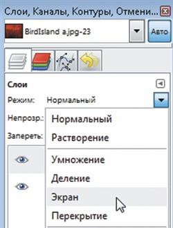Теперь оба слоя готовы для объединения в анаглифное изображение. Чтобы информация с соответствующих каналов каждого слоя отобразилась на конечной картинке, необходимо изменить режим наложения слоев. Выделите верхний слой и на палитре слоев в раскрывающемся списке укажите вариант суммирования слоев «Экран».