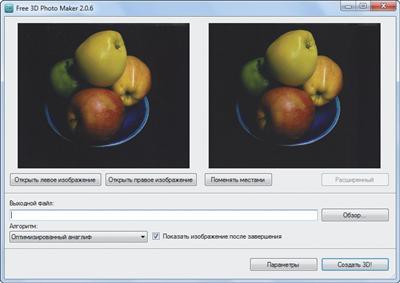 Одной из многочисленных программ, предназначенных для создания анаглифного изображения на основе стереопары, является Free 3D Photo Maker (www.dvdvideosoft.com/products/dvd/Free-3D-Photo-Maker.htm). Для работы с ней понадобится стереопара -- две фотографии одного и того же объекта, сделанные со смещением примерно 5--7 см. Загрузите снимки в программу. Если вы ошиблись с выбором изображения для правого и левого глаза, с помощью специальной кнопки быстро поменяйте их местами. Если потребуется, измените путь сохранения готового изображения.