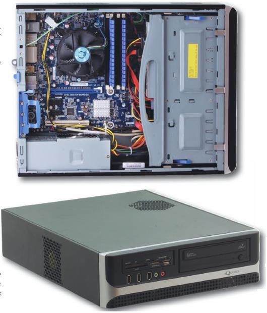 Компьютер компании Desten собран в приятном на вид компактном корпусе. Внутри располагается системная плата формфактора mATX, имеющая два свободных разъема расширения PCI, один PCI Express x1 и один PCI Express x16. Корпус охлаждается одним 120-мм вентилятором. На плате всего два разъема DIMM, так что расширение объема ОЗУ невозможно. Как и все ПК в данном обзоре, Desten eVolution 1433I снабжен памятью DDR3 с рабочей частотой 1333 МГц. Небольшое опасение вызывают распаянные на плате конденсаторы с жидким электролитом. Недостатком конфигурации является слишком слабый блок питания: здесь использован БП компании RealPower мощностью всего 350 Вт. При таком маломощном БП даже при незначительной модернизации может потребоваться заменить его более мощным.