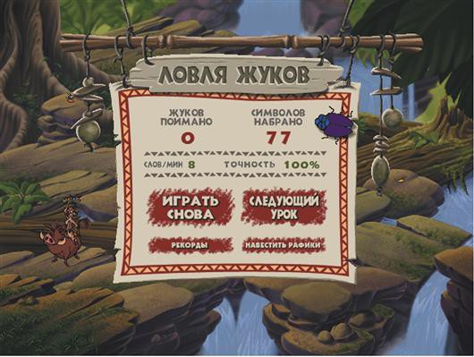 Теперь познакомимся с программой подробнее. Первое, что здесь ждет, -- это видеоролик, из которого следует, что парочка авантюристов (Тимон и Пумба) отправилась за новыми приключениями, позабыв про необходимый «инвентарь» (клавиатуру). Так что теперь отдуваться за все придется вам. Введите свое имя (если его еще нет в списке) -- и вперед!