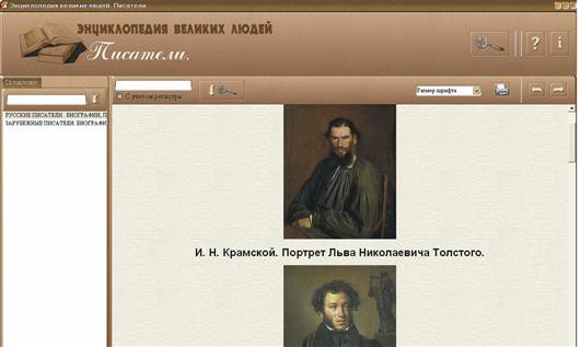 Первое, что радует на диске, -- это наличие трех поисковых систем: одна -- по содержанию, другая -- «Поиск в тексте», позволяющая искать не только по открытому тексту, но и по всей биографии целиком. С помощью третьей можно «проштудировать» весь диск, а заодно воспользоваться такими интернет-поисковиками, как "Яндекс", Google, а также новой российской поисковой системой Nigma.