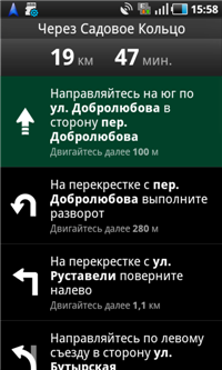 На карте маршрут рисуется с учетом пробок, причем сразу предлагается построить альтернативный путь. По умолчанию есть два ограничения, которые может задать пользователь, -- выезд на скоростные и платные дороги. Это, очевидно, заимствовано из американской практики, а у нас пока не актуально, и потому они были сразу отключены. До начала движения навигатор предлагает еще посмотреть и текстовое описание маршрута, как это делается и в классической интернет-версии. Полезное начинание, ведь можно изучить маршрут и повороты на нем, улицы, на которые надо будет свернуть и, в конечном счете, планировать движение на шаг вперед.
