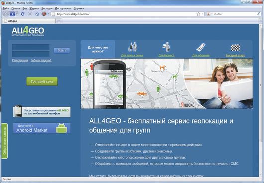 Проект All4geo позиционируется как сервис геолокации и общения для групп. Он помогает создавать группы друзей, знакомых, коллег и общаться с их участниками посредством бесплатных сообщений, например, извещая о своем местоположении, или отслеживая местоположение друг друга.