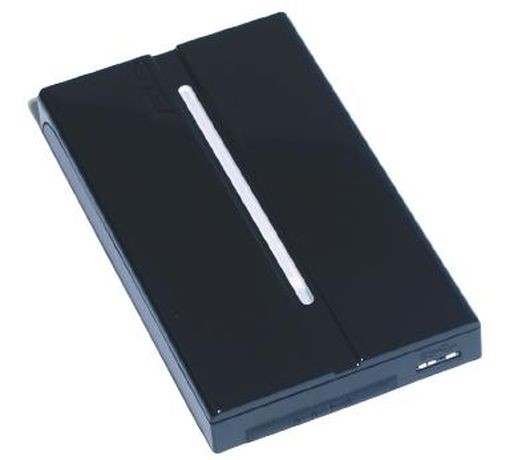 Упаковка также хорошо продумана -- пластиковый контейнер с накопителем дополнительно уложен в картонную коробку с прорезями, позволяющими оценить внешний вид модели еще до покупки. Не забыта и броская наклейка с указанием емкости -- еще бы, целый терабайт! Тем более что именно этот параметр в первую очередь привлекает внимание покупателя... Впрочем, достоинства на этом и заканчиваются. Нет ни кнопок, ни шторок -- только светодиод активности, спрятанный под полупрозрачную вставку, да один USB-порт на заднем торце устройства. Нет даже кабеля-раздвоителя для подачи дополнительного питания. Если вдруг порт ноутбука не сможет обеспечить должной мощности, пользователю придется побегать, подыскивая в магазине подходящий соединитель.