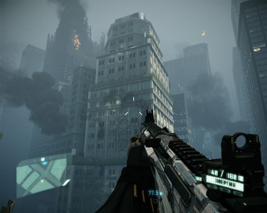 Первое впечатление, которое охватывает игрока «внутри» Crysis 2, -- как-то там тесно по сравнению с оригиналом! Действительно, такой свободы, как в первой Crysis, когда можно было пробежать весь остров по диагонали из конца в конец или обойти противника с любого направления, нет и больше не будет. Во-первых, это вредно влияет на насыщенность игры, во-вторых, нынешнее поколение приставок просто не готово к таким нагрузкам. Зато теперь мы можем насладиться тем, что сами разработчики с гордостью называют «вертикальным геймплеем». Со сменой тропических джунглей на улицы разрушенного Нью-Йорка геометрия игрового пространства наконец-то приобрела полноценное третье измерение -- высоту. Реализовано все это просто на загляденье: игрок горным козлом скачет по строительным лесам, всевозможным уступам и балконам, а иногда (в основном там, где это положено по сюжету) даже перепрыгивает с крыши на крышу между высотками. Не Assassin’s Creed с его безумным паркуром, конечно же, но для «стрелялок» в целом и для серии в частности -- большой шаг вперед!
