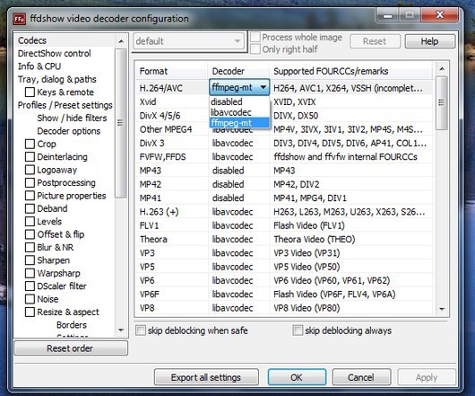 Во-первых, запускаем утилиту ffdshow video decoder из набора K-Lite Codec Pack. Здесь нужно убедиться, что для кодека H.264 задействован декодер libavcodec или ffmpeg-mt.