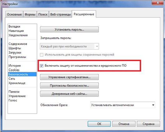 - в любое время можно отключить функцию «Защита от мошенничества» в меню «Настройки - Расширенные (Crtl-F12) - Безопасность».