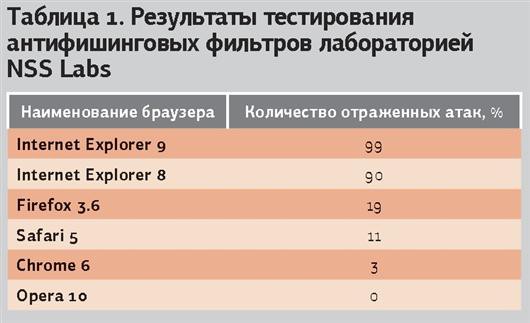 В октябре 2010 г. компания NSS Labs провела тестирование работы антифишинговых фильтров в браузерах: