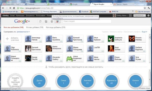 Разбить контакты на группы – не ново, но Google+ возвел этот принцип в ранг базовых. Так, если Facebook предлагает занести контакт в группу как необязательную опцию, то в Google+ это надо сделать обязательно. Обойти такое требование невозможно. Группы пользователей в идеологии Google+ называются кругами. Какие-то круги создаются автоматически, по умолчанию; какие-то пользователь организует самостоятельно. Число их не ограничено. Внешне формирование (и удаление) кругов максимально упрощено – надо перетащить «табличку» с контактом в нужный круг курсором мыши. Все действо сопровождается забавной и понятной анимацией. Результат не замедлил сказаться – многие пользователи благодарили Google за то, что он наконец заставил их упорядочить контакты.