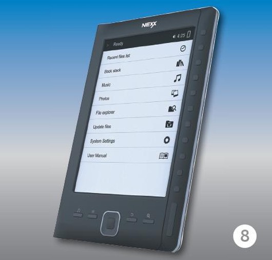 Компания Nexx, производитель разнообразной цифровой техники, также решила не отставать от других и выпустила на российский рынок несколько устройств под своим брендом. Рассматриваемая модель имеет черный пластиковый корпус с серебристыми вставками. К ней прилагается простенькая, но приятная на вид обложка, защищающая ее от внешних воздействий. Дисплей имеет диагональ 6 дюймов и разрешение 800х600 точек. Шрифты смотрятся контрастно и хорошо воспринимаются, углы обзора достаточно широкие для комфортного чтения. Перелистывание страниц занимает доли секунды.