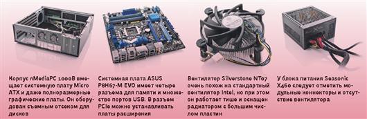 Корпус nMediaPC 1000B (Silverstone Lascala или др.) напоминает один из домашних аудио- или видеокомпонентов. В нем установлен безвентиляторный блок питания Seasonic. В целом вся конструкция работает довольно тихо, хотя абсолютной тишины нам добиться не удалось (в задней части корпуса расположены два вентилятора диаметром 60 мм). Модель Seasonic X460 очень эффективна во время простоев системы и в периоды, когда она работает с полной нагрузкой. В результате потребляется меньше электроэнергии и выделяется меньше тепла, что очень важно для блока питания, не имеющего вентилятора. Устройство имеет модульную конструкцию, и можно подключать только те разъемы, которые действительно необходимы.