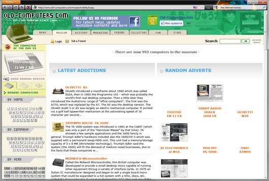 Основной и наиболее информативный раздел данного решения -- Museum. Это онлайновый каталог самого разнообразного компьютерного оборудования, выпущенного с 1950 по 1999 гг. Он состоит из трех основных разделов, выполненных в виде закладок на боковой панели страницы проекта, -- компьютеры, приставки и игровые одночиповые Pong-системы. Для навигации в них предлагаются алфавитные указатели марок машин, алфавит фирм-производителей, а также выбор года производства устройства.