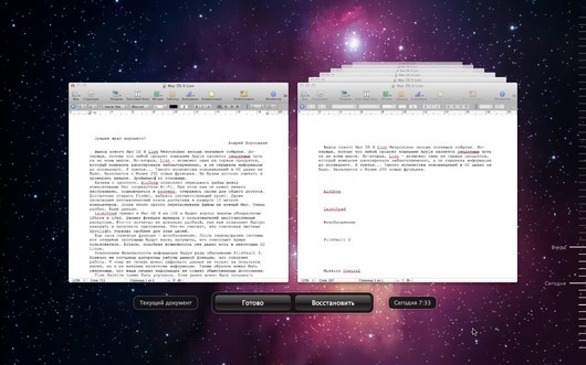 Time Machine также была улучшена. Если ранее можно было сохранять резервные копии только на внешнем диске, то теперь и на внутреннем винчестере, что иногда бывает полезно. И самое главное, в Mac OS X появилось автоматическое сохранение документов. Казалось бы, здесь нет ничего особенного, многие приложения умеют делать это. Однако в данном случае осуществляется не просто перезапись файла, а создание резервных копий каждые пять минут, т.е. можно вернуться к любому предыдущему состоянию документа. Причем работа с копиями происходит точно так же легко, как в Time Machine. Однако не обошлось и без маленькой ложки дегтя -- нельзя задавать частоту создания копий .