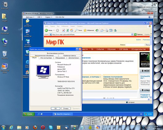 Работа с XP Mode довольно проста: включите функцию поддержки виртуализации в BIOS, а потом загрузите и установите два файла: виртуальную машину (Windows6.1-KB958559-x86.msu, 9,14 Мбайт) и системный образ (WindowsXPMode_ru-ru.exe, 446 Мбайт). Для запуска виртуальной системы служит команда Windows XP Mode группы Windows Virtual PC в системном меню «Пуск». Конфигурация гостевой системы не отличается от финального этапа инсталляции обычной Windows XP, да и процедура активации не требуется (индивидуальную настройку и загрузку обновлений оставим в стороне, упомянем лишь о том, что эти функции доступны).
