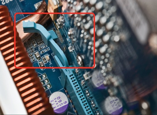 8. Большинство системных плат оборудованы небольшой защелкой, которая удерживает графическую плату в разъеме. Перед снятием видеоплаты эту защелку необходимо разблокировать.
