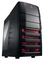 В данном решении производитель пошел на нестандартный шаг, использовав для оформления корпуса черный шероховатый пластик, за счет применения которого в сочетании с сетчатыми вставками изделие выглядит броско и необычно. Большая часть левой стенки сделана из прозрачного пластика, что понравится любителям подсвечивать внутренности системы, используя светодиоды. Все дополнительные интерфейсы выведены на верхнюю часть, их, правда, не так много, как того хотелось бы. Кнопки включения питания и перезагрузки стоило бы выделить, например, цветом, а то они сливаются с корпусом. Ножки, обеспечивающие устойчивость, в этой модели сделаны из резины, что помогает гасить возникающую в процессе работы вибрацию. Производитель неплохо продумал и систему вентиляции. Здесь уже установлено несколько малошумных вентиляторов, причем большая часть из них снабжена светодиодной подсветкой. Находящийся в передней части и работающий на вдув охладитель выполнен из прозрачного пластика и подсвечивается светодиодами при работе. Выглядит это весьма приятно. Расположенные в верхней части вентиляторы -- они, кстати, тоже используют иллюминацию -- неплохо бы защитить съемными фильтрами. А на тот случай, если пользователь решится применить еще и систему жидкостного охлаждения, на задней панели предусмотрено отверстие для шлангов, правда всего лишь одно.