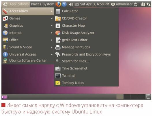 В мире существует множество различных версий Linux, но я рекомендовал бы Ubuntu. Чтобы установить Ubuntu параллельно с Windows, нужно загрузить ОС, записать ее на CD, создать на диске новый раздел, загрузиться с CD Ubuntu и следовать инструкциям. Подробности приведены на справочной странице сайта Ubuntu, посвященной созданию конфигурации с двойной загрузкой: Windows и Linux (find.pcworld.com/71658) или http://ubuntuguide.org/wiki/Ubuntu:Lucid_ru#.D0.94.D0.B2.D0.BE.D0.B9.D0.BD.D0.B0.D1.8F_.D0.B7.D0.B0.D0.B3.D1.80.D1.83.D0.B7.D0.BA.D0.B0_Windows_.D0.B8_Ubuntu.