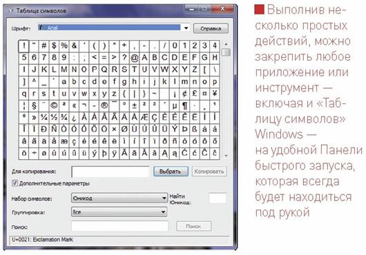 Итак, выберите «Пуск*Все программы*Стандартные*Служебные». В отобразившемся на экране меню вы увидите «Таблицу символов». Щелкните на этом пункте правой кнопкой мыши (да-да, именно правой), удерживая палец, перетащите значок на Панель быстрого запуска и отпустите кнопку.
