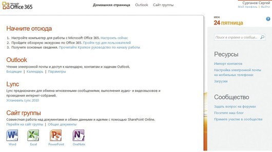 На связи. Чтобы начать работу с Office 365, требуется зайти на страницу portal.microsoftonline.com, где нужно ввести свой идентификатор Microsoft Online Services и пароль, выданный администратором компании, после чего будет доступна основная страница (см. рисунок), внешний вид которой зависит от того, какой версией сервиса пользуется клиент. В основной части страницы размещен перечень главных компонентов сервиса, а также быстрые ссылки; например, для Outlook это доступ к входящим сообщениям, календарю и параметрам сервиса. В правой части страницы размещены ссылки для доступа к ресурсам: импорт контактов, настройка электронной почты и загрузка локальных версий офисных продуктов, а также там находятся справка по сервису и доступ к сообществу по Office 365.
