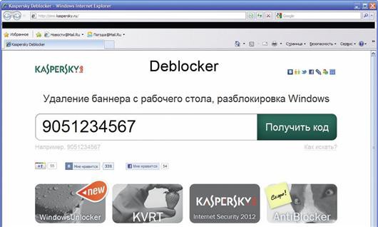 Второй ресурс, принадлежащий ЗАО «Лаборатория Касперского», располагается по адресам sms.kaspersky.ru и support.kaspersky.ru/viruses/deblocker. Первый вариант поможет сгенерировать код разблокировки, используя номер телефона, указанный злоумышленниками, а второй наряду с этим умеет подбирать коды по банковскому счету.