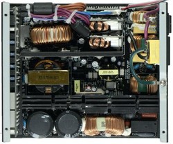 Внутренности блока, как уже упоминалось, произведены компанией AcBell. Предусмотрены два радиатора: один -- в низковольтной части, на нем закреплены полупроводниковые выпрямители, другой -- в высоковольтной, он отводит тепло от силовых ключей в составе высокочастотного генератора, а также активного PFC. Стоит отметить, что на этикетке блока нет ни слова о сертификации 80 PLUS, хотя на сайте у обеих моделей (на 900 и на 1200 Вт) красуется значок 80 PLUS Silver. Видимо, образец был отправлен нам до окончания процедуры сертификации.