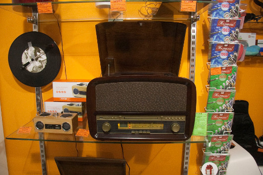 Итак, вот радиоприемник, объединенный с проигрывателем пластинок. Сейчас и пластинки-то поди-поищи, а у кого есть — пользуют крутые аппараты за тысячи долларов. А здесь — пожалуйста. Недорогие как будто бы старые радиолы с простенькими, но вполне рабочими «вертушками». Но, понятное дело, они снабжены и слотами под USB и SD-карты, и CD-проигрывателем (который сам по себе мало-помалу также уходит в ретро…) Конечно, это вещи простые, недорогие. А когда присмотришься к ним, то поймешь, что в пору их распространения в быту и пластика такого не было, и к дереву относились куда расточительнее… И тем не менее издалека — очень похоже. И забавно.