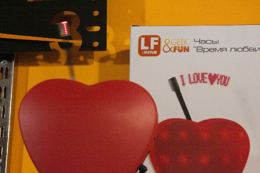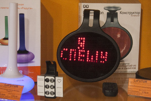 С часами в LeFutur всегда было хорошо, некоторые из них не сходят с прилавков годами. Вот, к примеру, «Время любви». Собственно время на них отображается на молниеносно раскачивающихся спицах, туда же можно вставить до трех сообщений — что-то вроде признания в любви. Светящиеся буквы и цифры, парящие и мерцающие прямо в воздухе, завораживают меня от раза к разу все больше — просто не оторваться. И сфотографировать не удается: затвор выхватывает лишь одно мгновение. Вон оно, слева наверху…