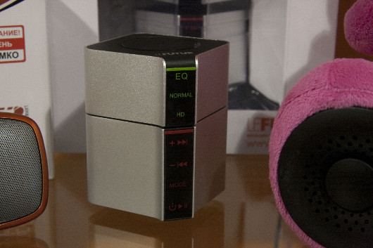 А теперь и дальше — по звуку. На полках стоят разного рода портативные колонки, мимо одной из которых, некогда подобной описанной и попутно восхваленной Голубицким, я пройти не сумел. Называется она «Виброколонка Cowin». Сама по себе эта колонка совсем маленькая, но выдает довольно большой звук, ибо в качестве резонатора использует ту поверхность, на которой стоит. Если с поверхностями немного поэкспериментировать, добиться можно весьма многого. Проверял.