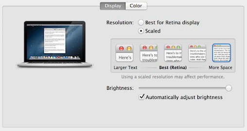 Хотя Apple и позиционирует новый экран как Retina -- эта марка присваивается дисплеям, на которых человеческий глаз не в состоянии различить отдельные точки, — все же плотность точек здесь ниже, чем у экранов на iPhone и на новом поколении iPad. У дисплея MacBook Pro Retina плотность разрешения составляет 220 тнд, в то время как у планшетного компьютера iPad, представленного в марте, она равна 264 тнд, а у iPhone – 326 тнд. Но поскольку расстояние от глаз до экрана компьютера больше, чем до экрана смартфона или планшетного компьютера, разница становится незаметной.