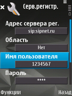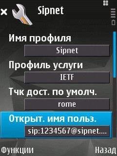Имя профиля может быть любым: «Профиль услуги» — IETF; «Точка доступа по умолчанию» -- выбираем нужное интернет-соединение; «Открытое имя пользователя» — идентификатор, полученный при регистрации, который записывается следующим образом: <ваш идентификатор>@<домен>, например 1234567@sipnet.ru ; «Использовать сжатие» — нет; «Регистрация» -- всегда или по требованию; «Использовать защиту» -- нет. Затем открыть здесь же раздел «Сервер регистрации: Адрес сервера регистрации» -- sipnet.ru, «Область» -- etc.tario.ru (можно оставить пустым); «Имя пользователя» -- ваш числовой идентификатор; «Пароль» -- ваш пароль.