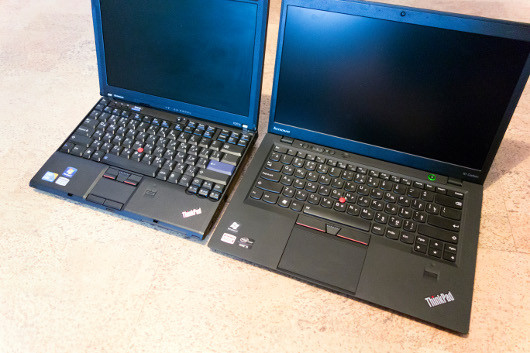 | Справа ThinkPad X201s, на котором еще даже нет логотипа Lenovo, слева -- X1 Carbon |