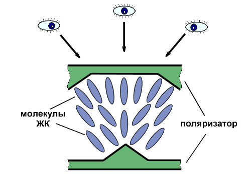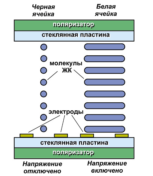 Если объединить эти особенности поляризационных фильтров и свойство жидких кристаллов управляемо поворачивать плоскость поляризации проходящего света, то получится ячейка, прозрачность которой можно изменять с помощью электрического сигнала.