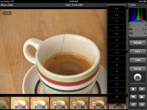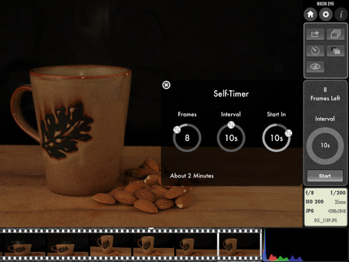 Приложение CameraMator поддерживает основные параметры настройки фотоаппарата, позволяя регулировать выдержку, диафрагму, чувствительность и баланс белого. При нажатии кнопки затвора фотоаппарат снимает очередной кадр, который уже через несколько секунд появляется в приложении. В режиме Live View зеркало фотоаппарата поднимается, а на экране iPad появляется картинка, которую захватывает объектив. Правда, отображается она с низким разрешением и низкой частотой смены кадров.